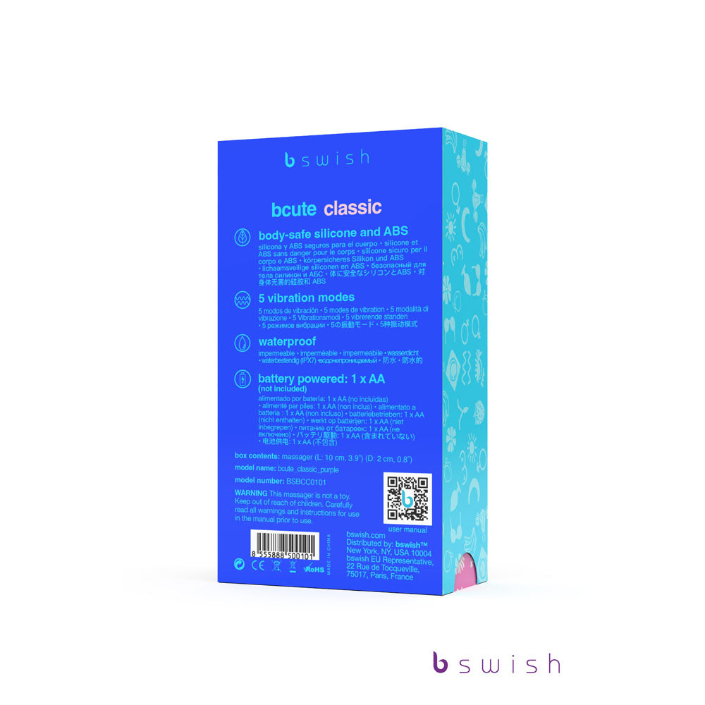 The Bcute Classic is our girl next-door - basic upon first glance but you’ll soon fall head-over-heels. Small for travel and big on pleasure – this spine-tingling device has 5 intense, yet quiet vibrations to use as your secret weapon. Enjoy the sensation of silky, nonporous silicone – it’s waterproof for limitless play. With up to 3 hours of fun, 1 AA battery is all it takes to keep this party going. - Colour: Purple - Materials: Silicone, PU-Coated ABS Plastic - Body-Safe: Yes - Waterproof: Yes - Care: Soap and Water - Lube Pairing: Water Based - Diameter: 2 cm - Total Length: 10 cm - Battery Type: 1 x AA - Use Time: 3 Hours - Backlight Colour: White - Box Contents: 1 Massager