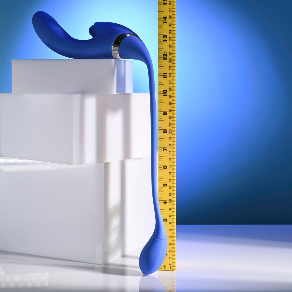 Go all in for pleasure! This unique toy features a gently curved, flexible, thrusting main shaft and a tapping stimulator that's designed to thumpity-thump in multi-speeds right where you want it most. Finally, a long flexible tail finishes with a plump, ergonomic vibrating plug to complete the rapturous experience. All 3 motors are controlled independently with their own buttons at the chunky centre base that offers a relaxed grip. - 7 thrusting speeds in main shaft (0.6 cm thrust) - 10 vibrating speeds and patterns in tail plug - 3 tapping speeds in stimulator - Insertable length: 8.9 cm, insertable diameter: 3.6 cm - Made from phthalate- and latex-free silicone and ABS - USB rechargeable, cable included - Height: 45.0 cm, depth: 15.0 cm, width: 4.6 cm - Waterproof