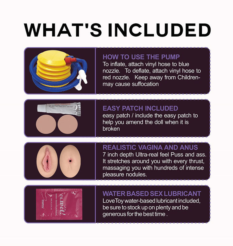 Are you looking for the affordable quality love dolls? we have it all inside the box. Fully-crafted from her face, she specially details with a pair of voluptuous realistic silicone breasts with real feel nipples. That is so amazing and different from other inflatable dolls in the market. Victoria has tight realistic pussy and ass made from TPE - an ultra-real feel material that makes her tight entries feel amazing. Plunge into either to experience a 7 inch depth that stretches around you with every thrust, massaging you with hundreds of intense pleasure nodules. A gentleman always uses lube, so be sure to stock up on plenty and be generous for the best time. - Lifelike inflatable love doll With silicone breast for authentic play - Breast Made of silicone, Soft Pert and breasts can be tweaked and fondled like real thing - 17.8 cm Textured realistic pussy and ass offer tight, lifelike sensations - 2 love holes to fill at any time with no fussy - Measures 165 cm tall when inflated - Flowing hair and delicate eyelashes add authenticity - Includes One Pair of Anus Vagina, foot pump, puncture repair kit and Lubricant for easy care - Body Material: PVC - Breast Material: Silicone - Vagina Material: TPE