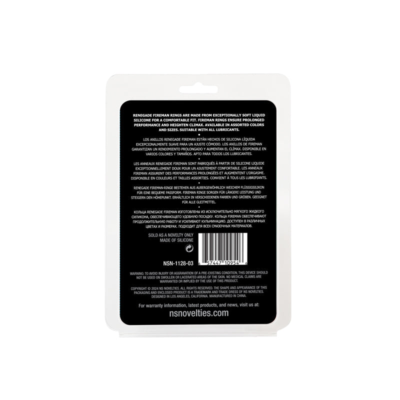 Renegade Fireman Rings are made from exceptionally soft liquid silicone for a comfortable fit. Fireman rings ensure prolonged performance and heighten climax. Available in assorted sizes. Suitable with all lubricants. - Product Weight: 110 grams - Product Dimensions: S: 4 cm x 4 cm x 1.1 cm M: 5 cm x 5 cm x 1.3 cm L: 6 cm x 6 cm x 1.6 cm - Product Material: Silicone